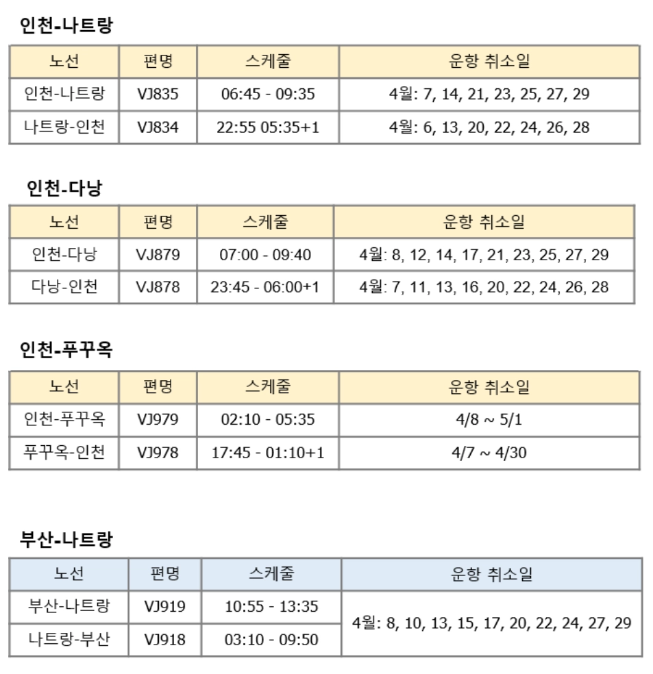 2026년 4월 인천(부산) 나트랑, 다낭, 푸꾸옥 운항 일부 취소 추가 안내