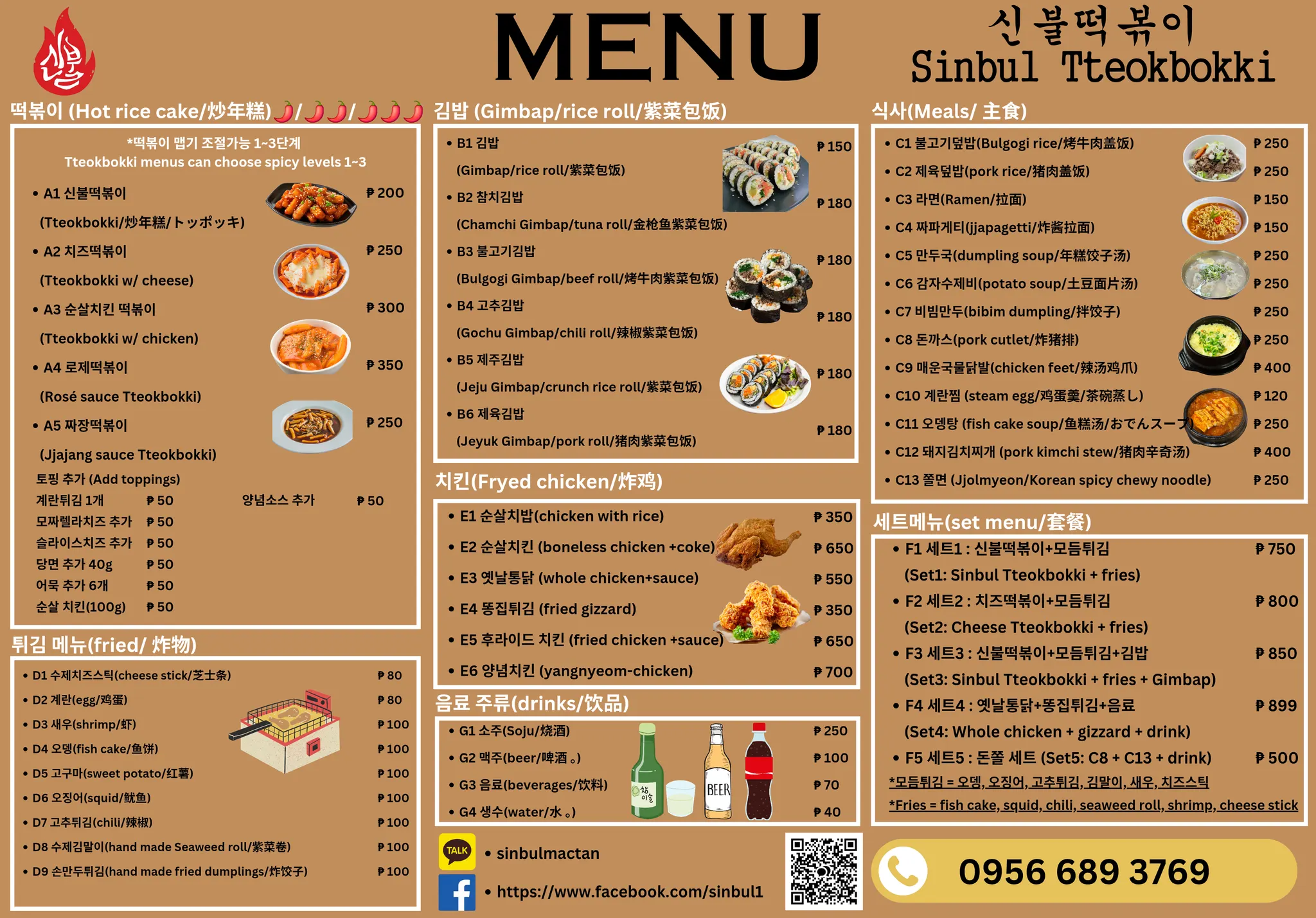 떡볶이 + 김밥 + 모듬튀김 세트3번 × 2세트 (₱850, 약 21,250원)